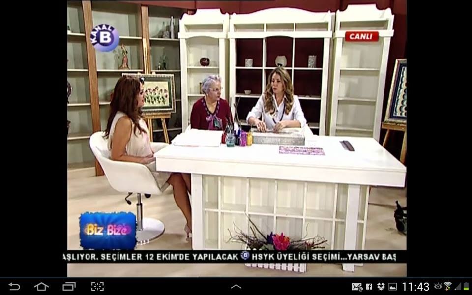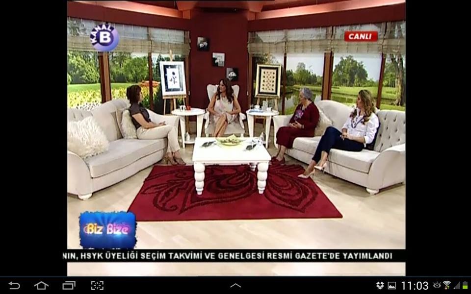 26 Ağustos 2014 saat 10:00-11:30 saatleri arasında hocam Hülya İlter, Ebru arkadaşım Büşra Sürmeli Şaşmaz ve ben, Kanal B de Biz Bize programında canlı yayın konuklarıydık. Ebru sanatı hakkında konuştuk, Ebru sanatına ne zaman, nasıl gönül verdiğimizi anlattık, sizlere örnekler sunduk. Çok keyifli ve güzel bir program oldu. İzlemeyenlere izlemelerini öneririm. Kanal B’nin arşivinden görüntülere ulaşabilirsiniz.