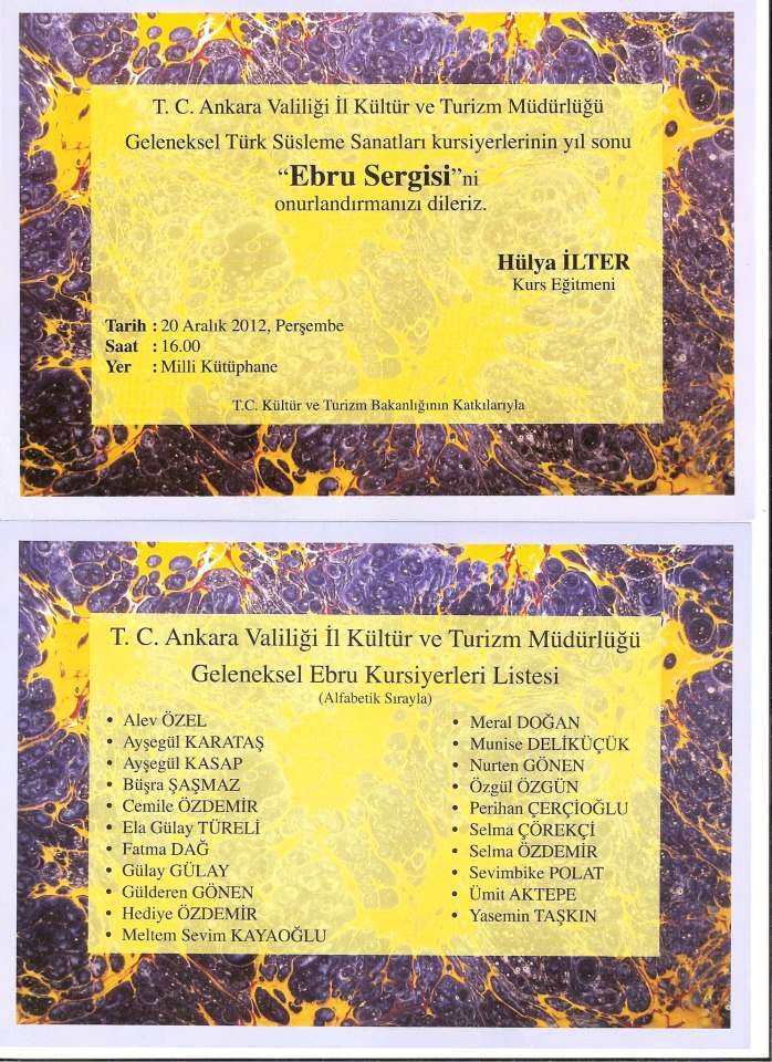 AKM Grubu Sergisi- Aralık 2012- 20 -23 Aralık 2012 tarihleri arasında Milli kütüphane sergi salonunda düzenlenen AKM Ebru sanatı kursiyerleri sergimiz. Hülya İlter hocamiz ve Sergide Eserleri bulunan kursiyerler… Bunu paylaş: X'te paylaşmak için tıklayın (Yeni pencerede açılır) X Facebook'ta paylaşmak için tıklayın (Yeni pencerede açılır) Facebook Beğen Yükleniyor...